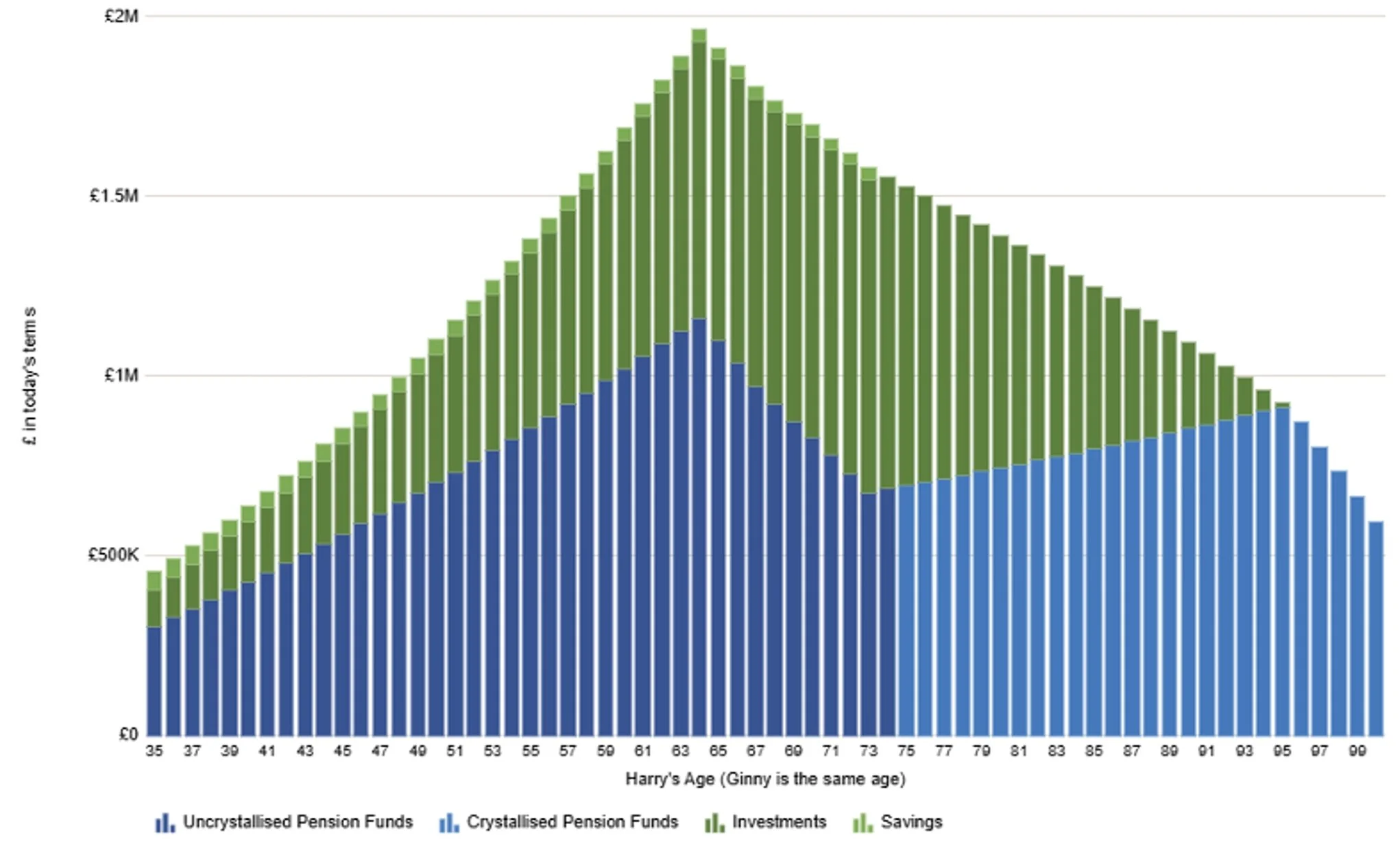Their spending needs are estimated at £8,500 a month, comprising base ‘lifestyle’ spending of £6k pm plus mortgage costs of £2.5k pm. Lifestyle costs are assumed to rise with inflation.