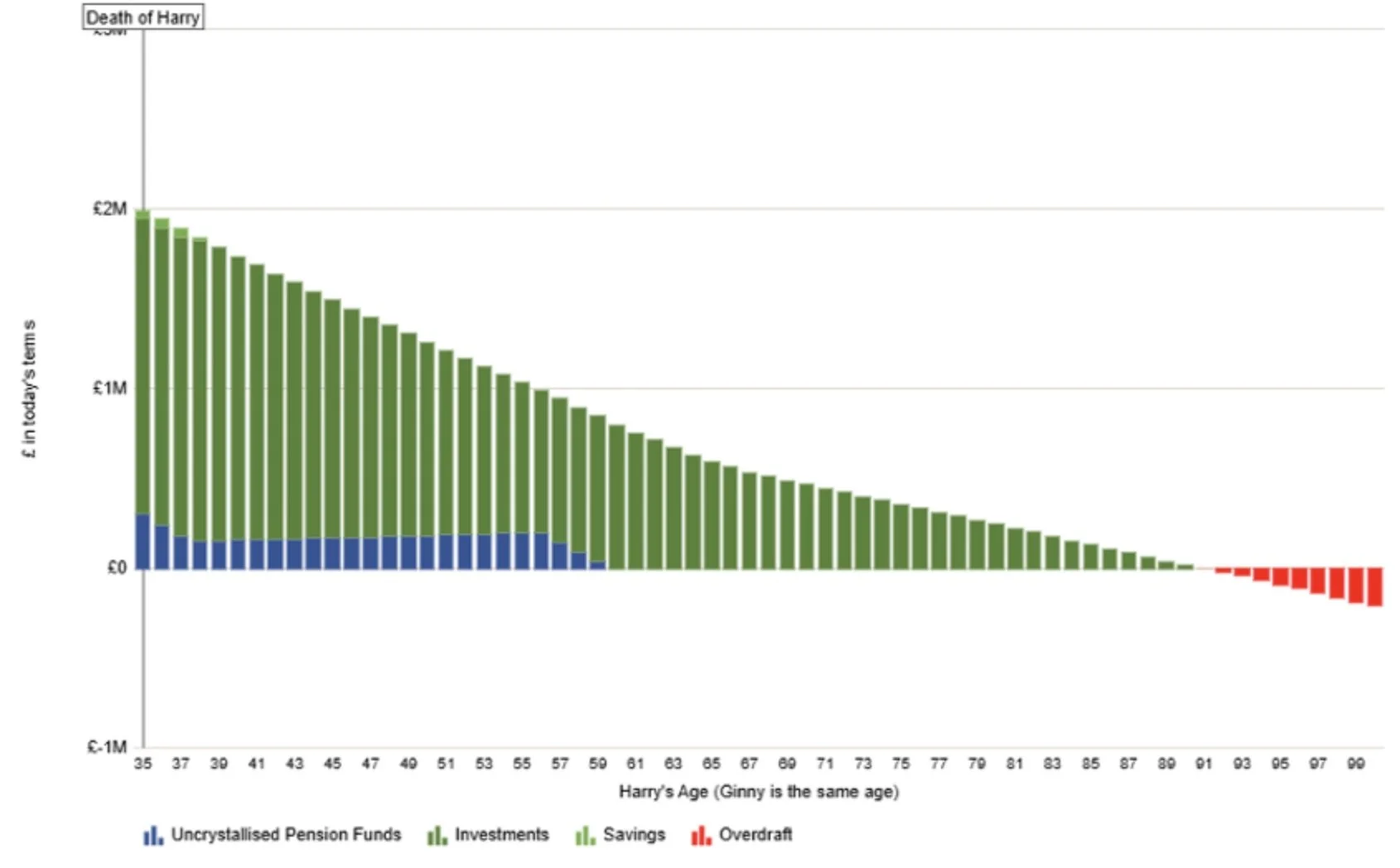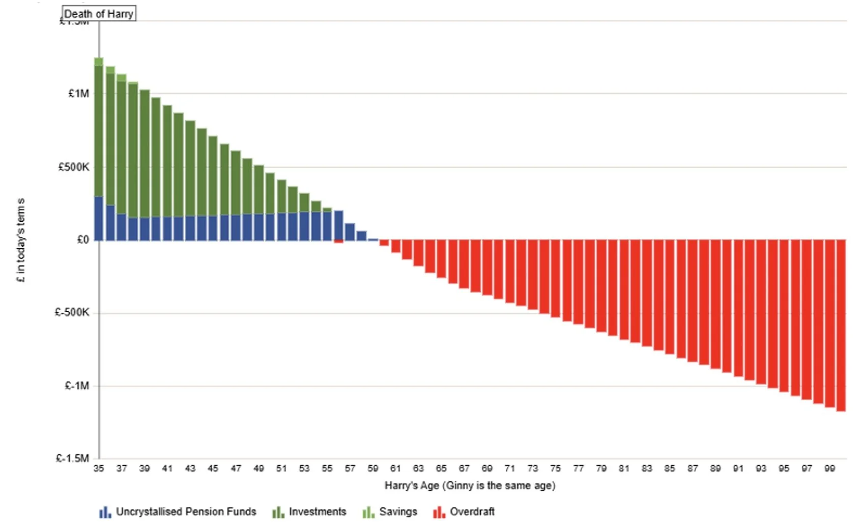 Focussing on the first of these scenarios – death of Harry, the chart below shows revised projected liquid capital in the event of Harry’s imminent demise: