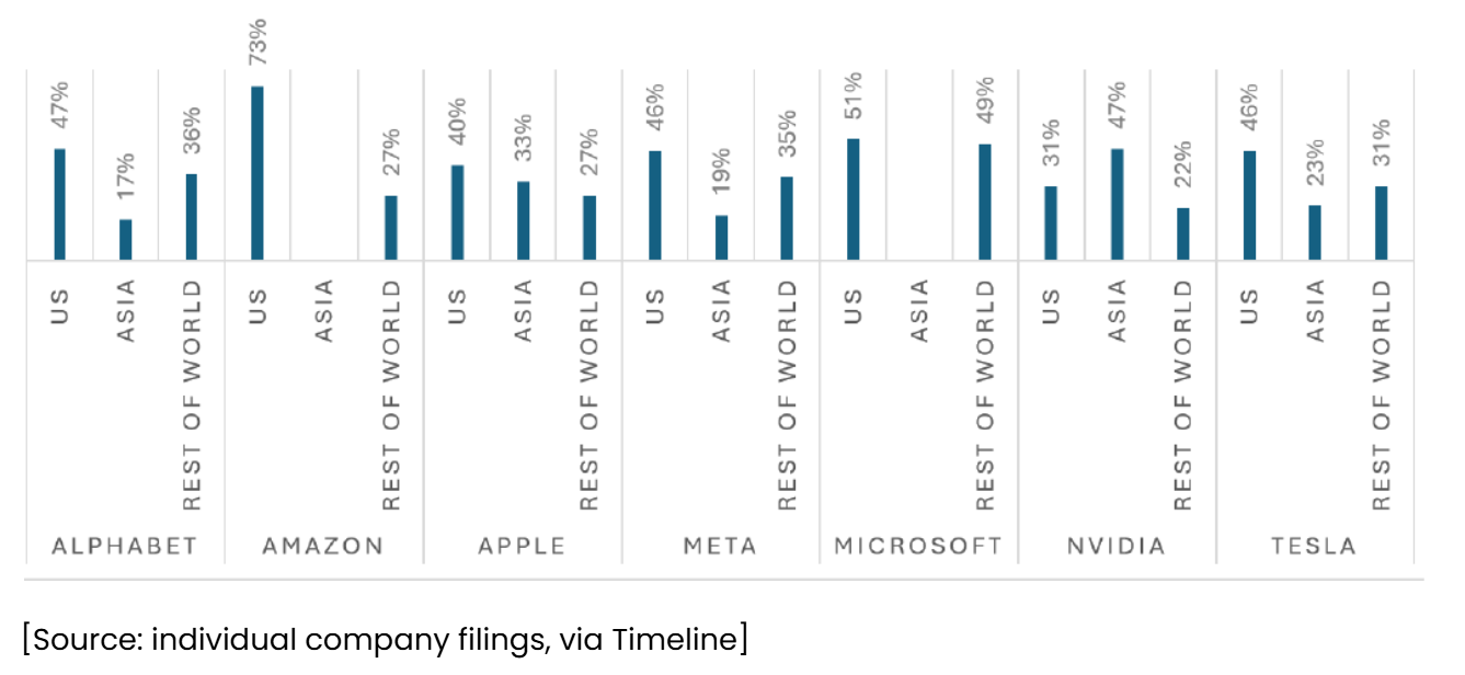 The chart below shows the revenue breakdown for the Magnificent Seven tech giants, based on their own filings. Most generate 50–60% of their income from outside the US.